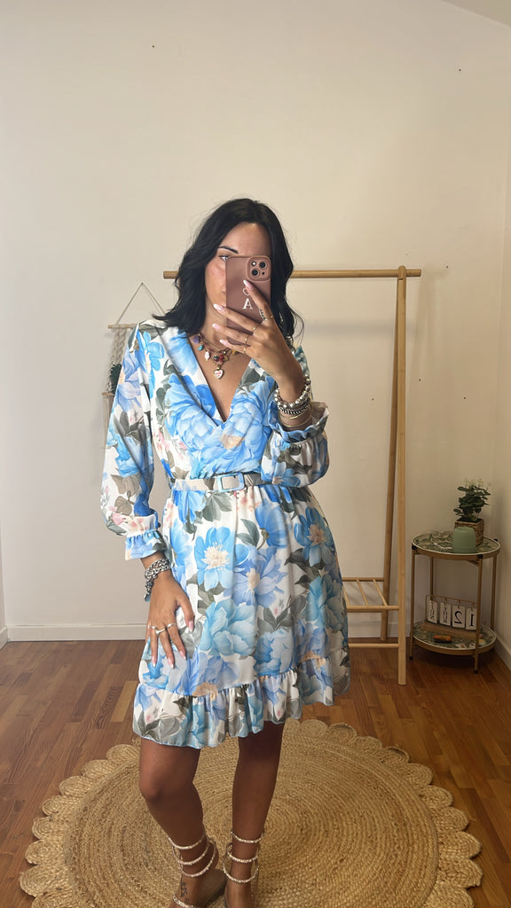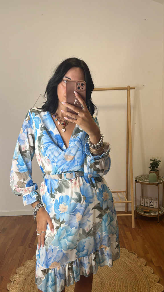 Abito Akemi azzurro, tg unica da 40 a 46, foderato cintura compresa,