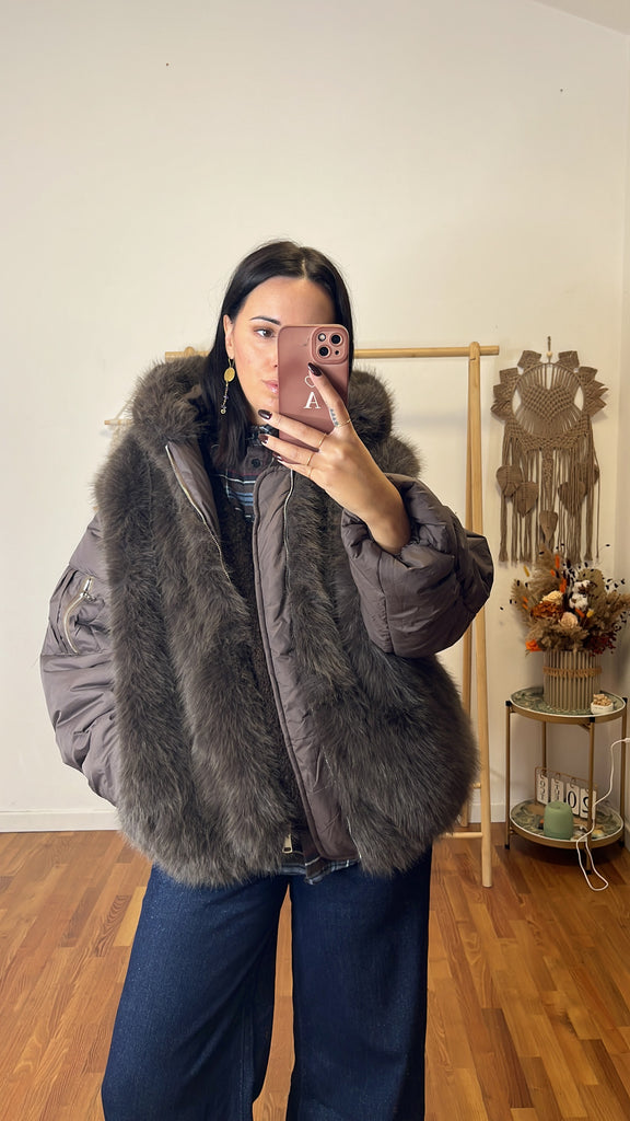 Bomber Alessandra cioccolato chiaro, tg unica fino 46, super caldo , maniche stile piumino e parte del corpo e cappuccio in ecopelliccia, cerniera a scomparsa e tasche vere.