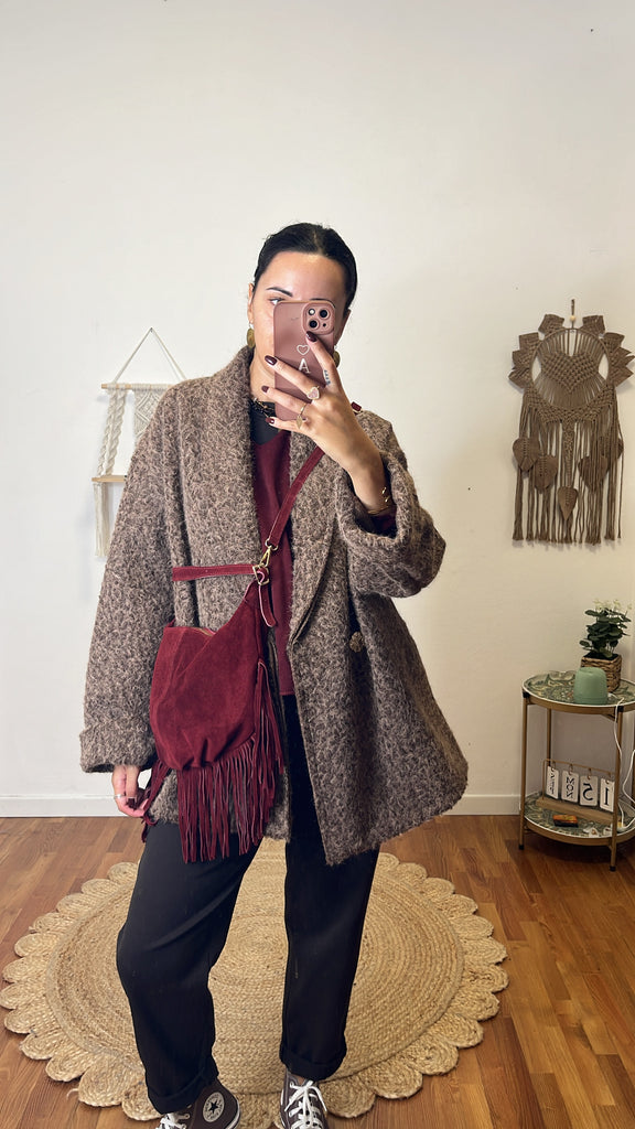 Borsa Kesha a mezza luna , in camoscio e frange , variante Bordeaux , tracolla regolabile .