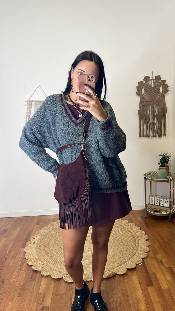Borsa Kesha a mezza luna , in camoscio e frange , variante burgundy , tracolla regolabile .