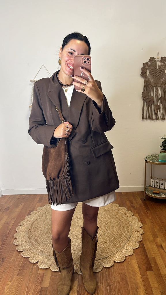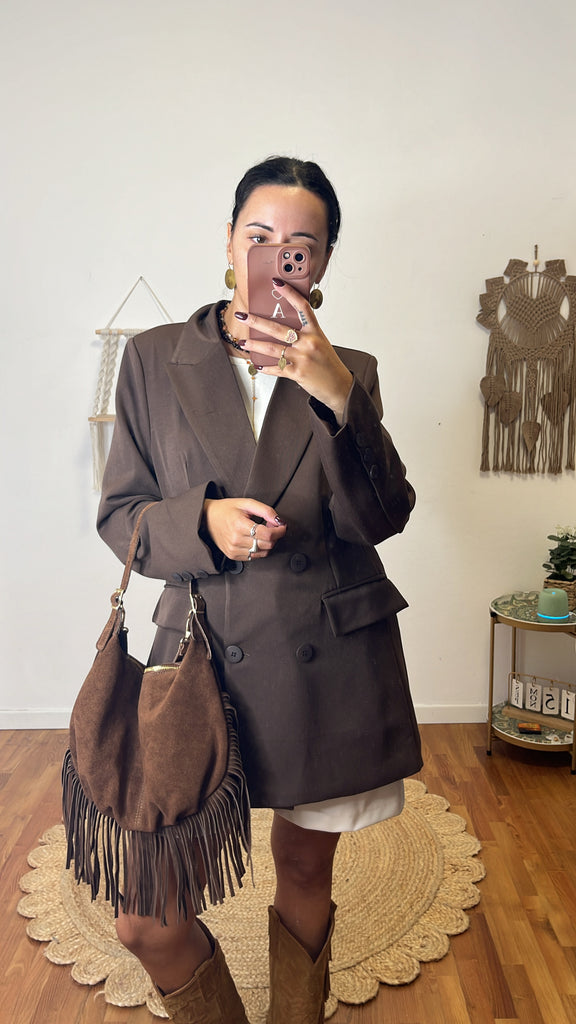 Borsa Kesha a mezza luna , in camoscio e frange , variante marrone, tracolla regolabile .