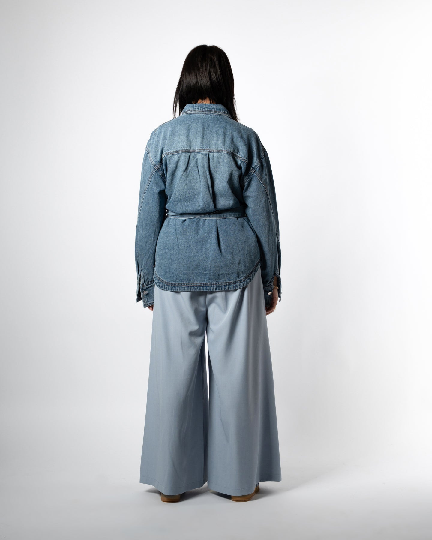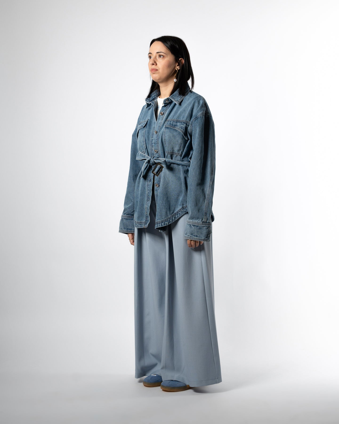 Giacca/Camicia in jeans molto versatile, taglia unica adatta dalla 40/42 fino alla 46, con cintura inclusa nel prezzo.