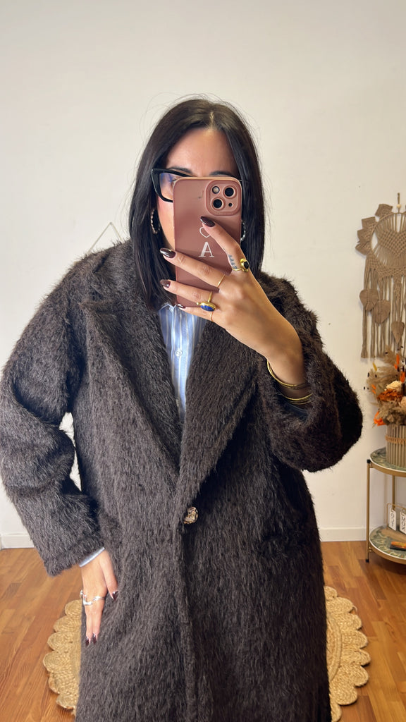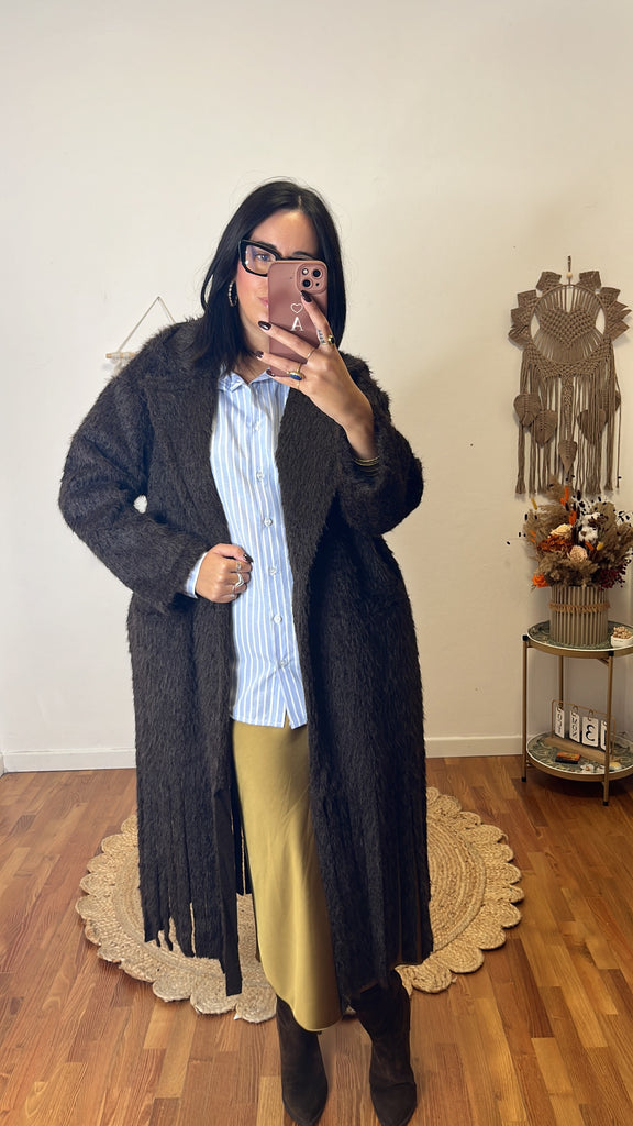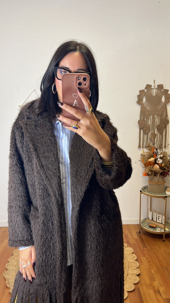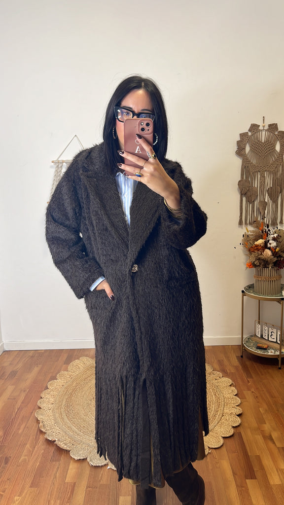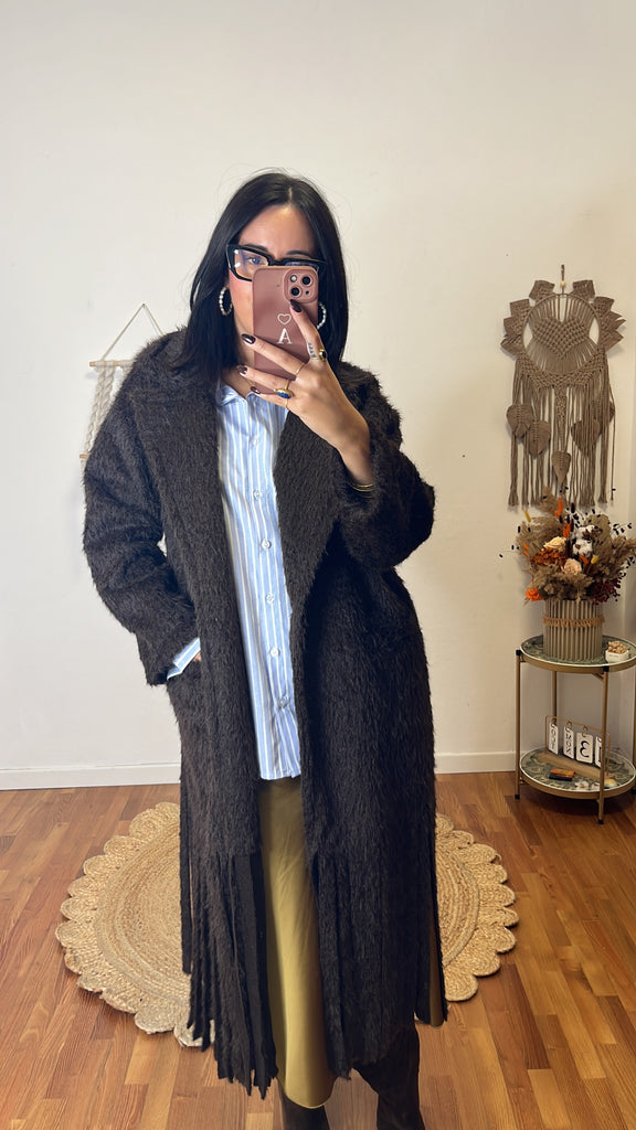 Cappottino Vanessa cioccolato fondente, tg unica fino 46, frange sul fondo , sfoderato ma molto caldo.