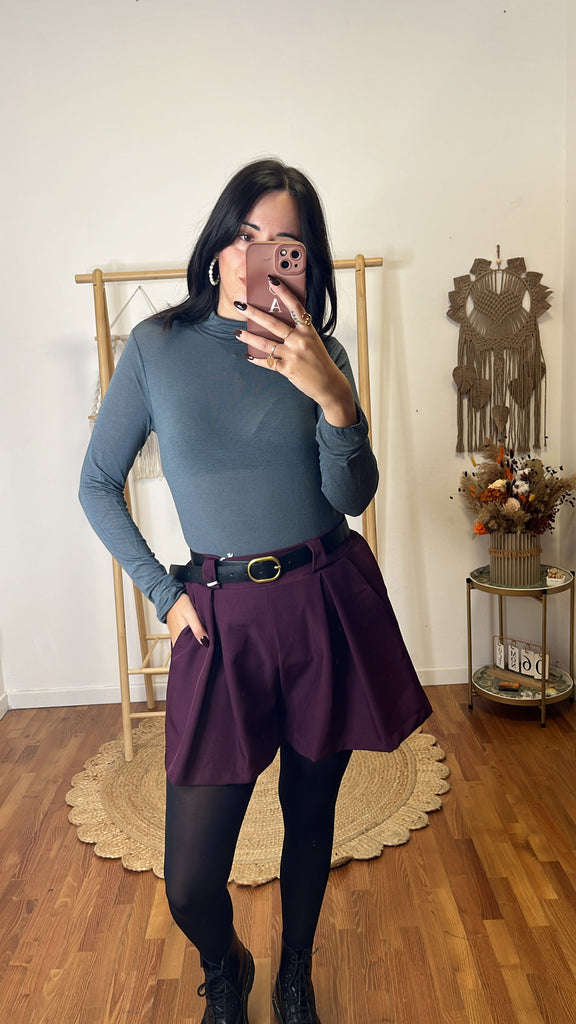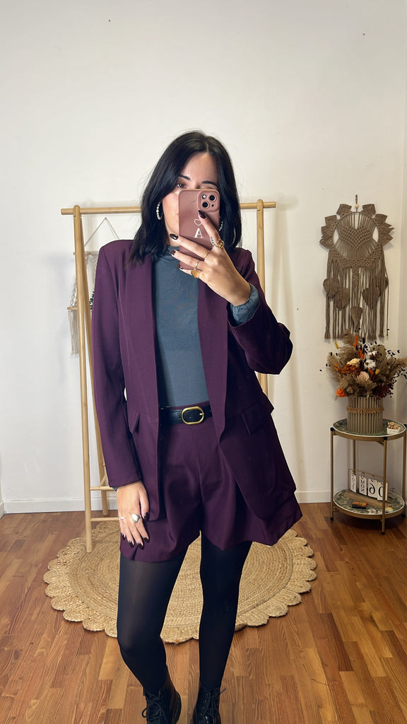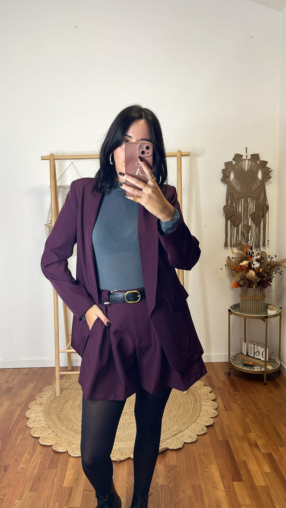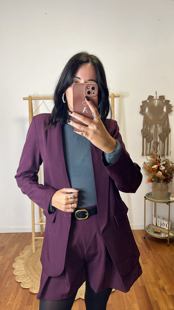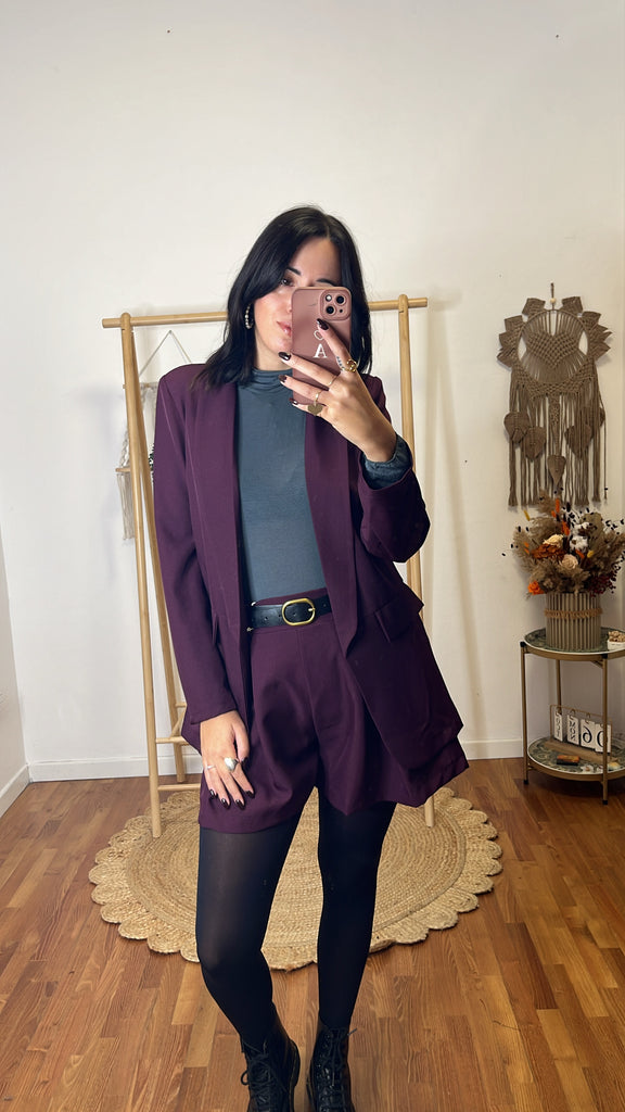Coordinato Matilde prugna, tg unica fino 44/46, blazer sfoderato , shorts tutto elastico in vita e tasche ( cintura compresa nel prezzo ) .