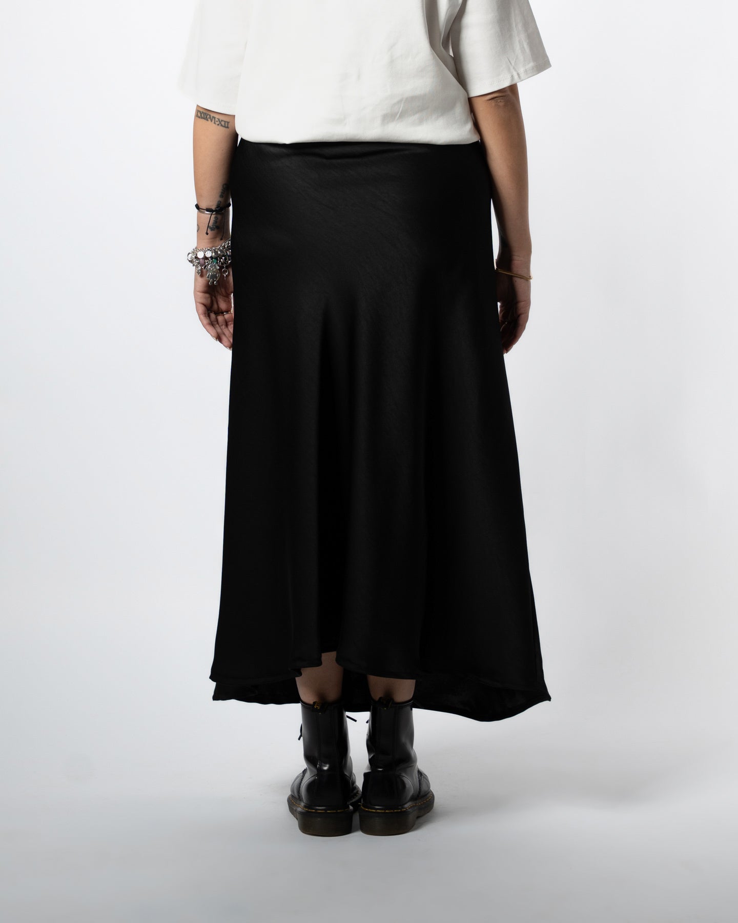 Gonna lunga in raso satin nero, con vita completamente elasticizzata, taglia unica adatta dalla 40/42 alla 44/46.