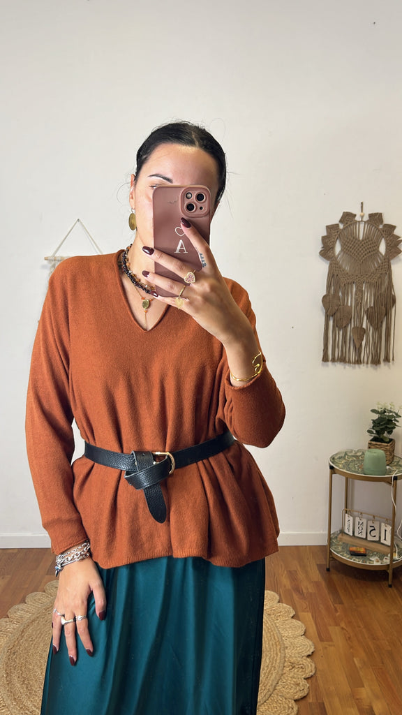 Maglia Ramona ruggine , tg unica fino 46 abbondante , in caldo cotone elasticizzato , scollo a V.