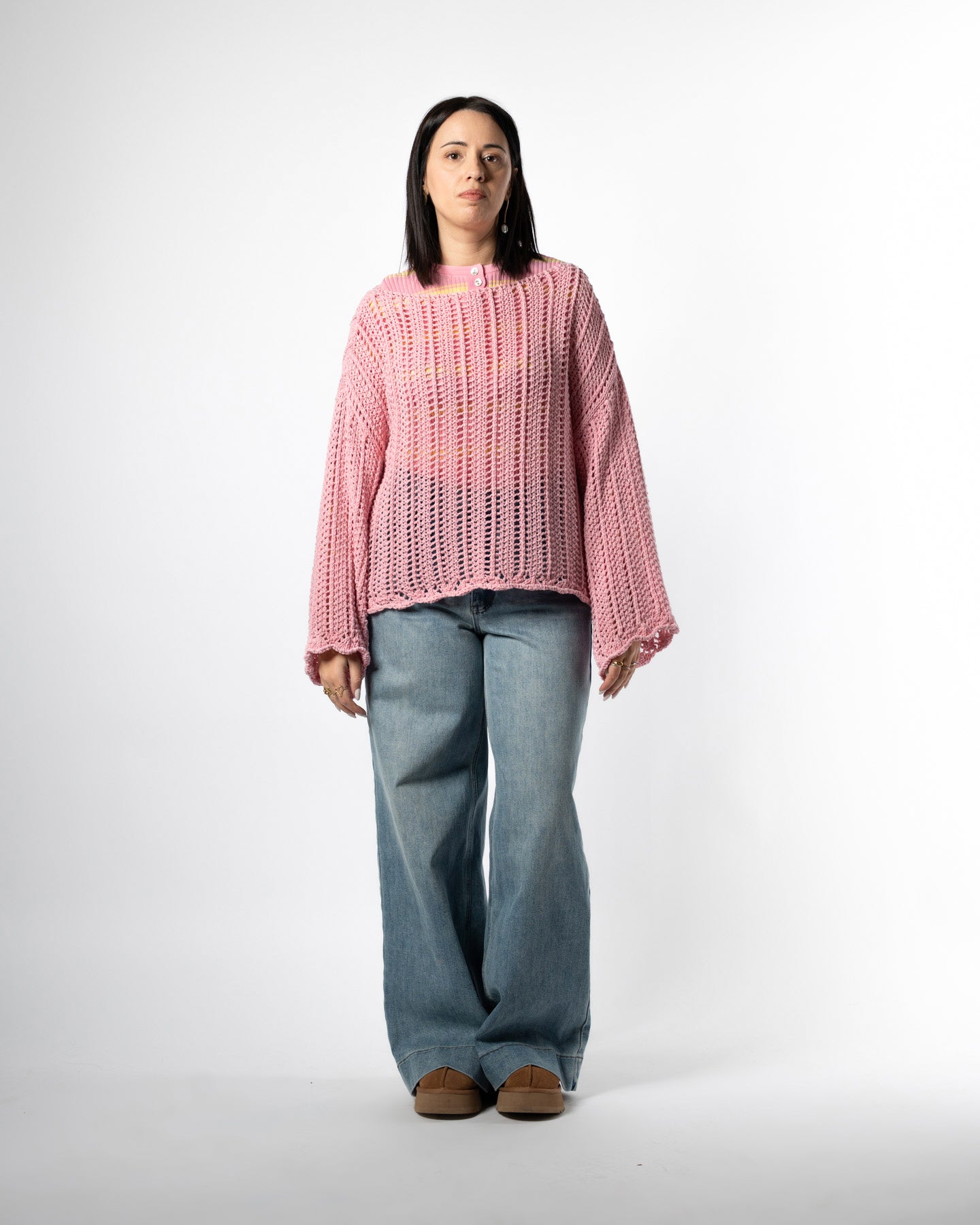 Maglioncino rosa in cotone, taglia unica adatta dalla 40/42 fino alla 46, con manica ampia sul fondo.