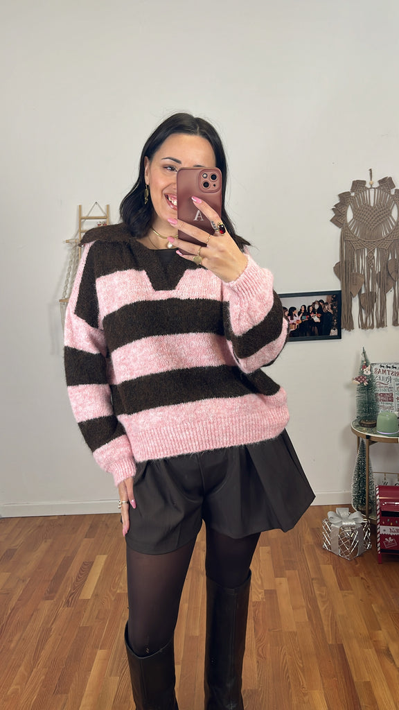 Maglione righe caffè e rosa, tg unica fino 46, morbido e molto caldo .