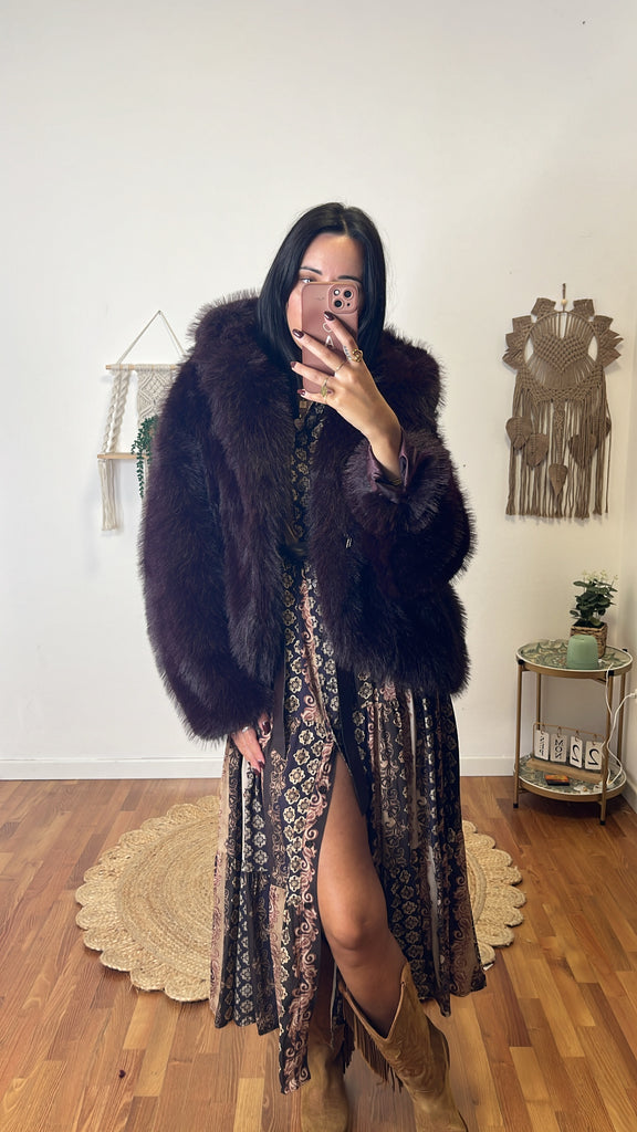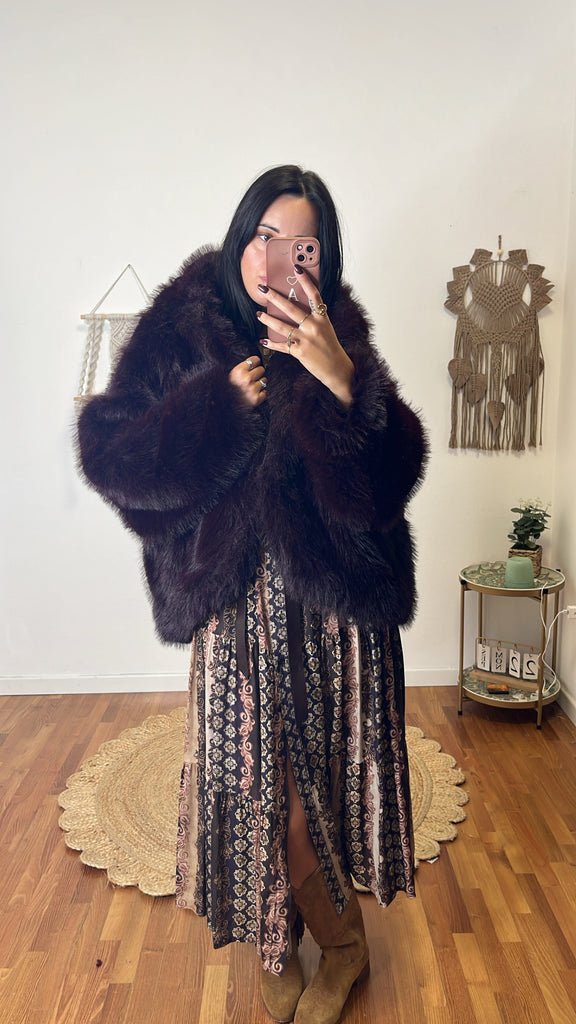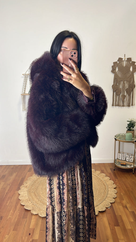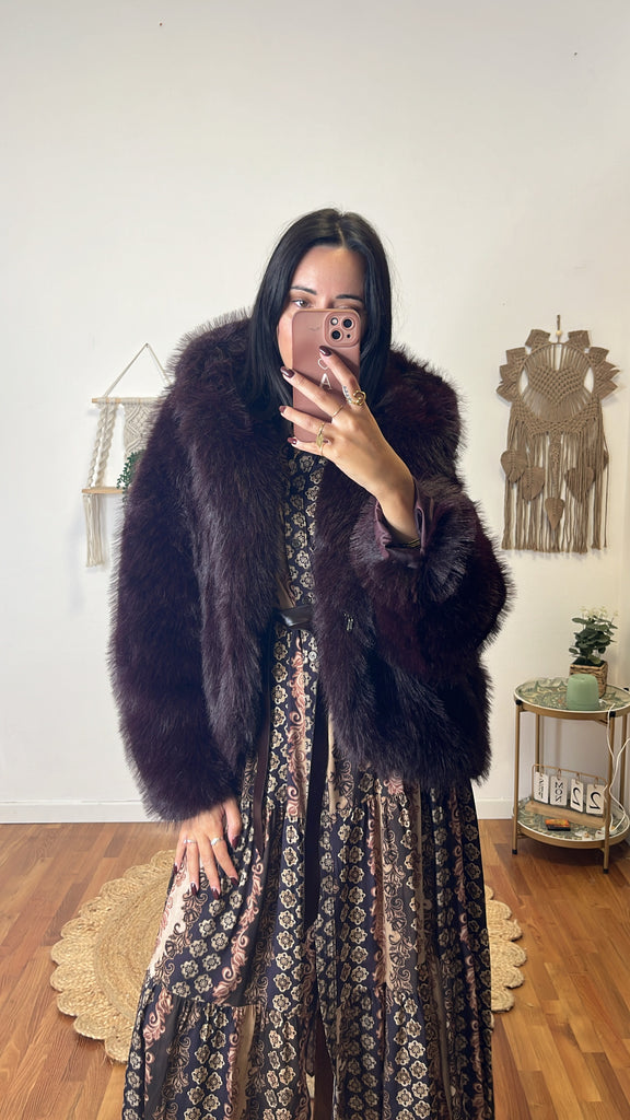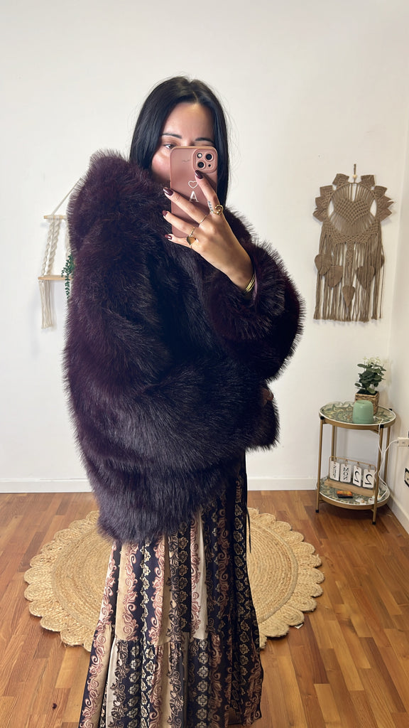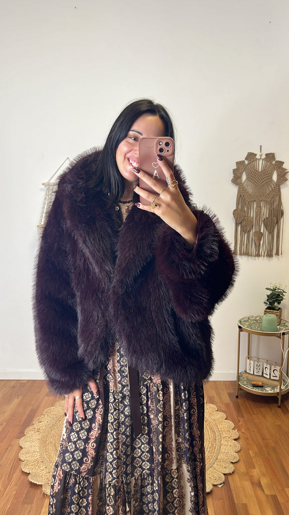 Pelliccia ambrosia burgundy , tg S/M o M/L, veste morbido . Cappuccio comodo , tasche , bottone per tenerla chiusa a scattino .