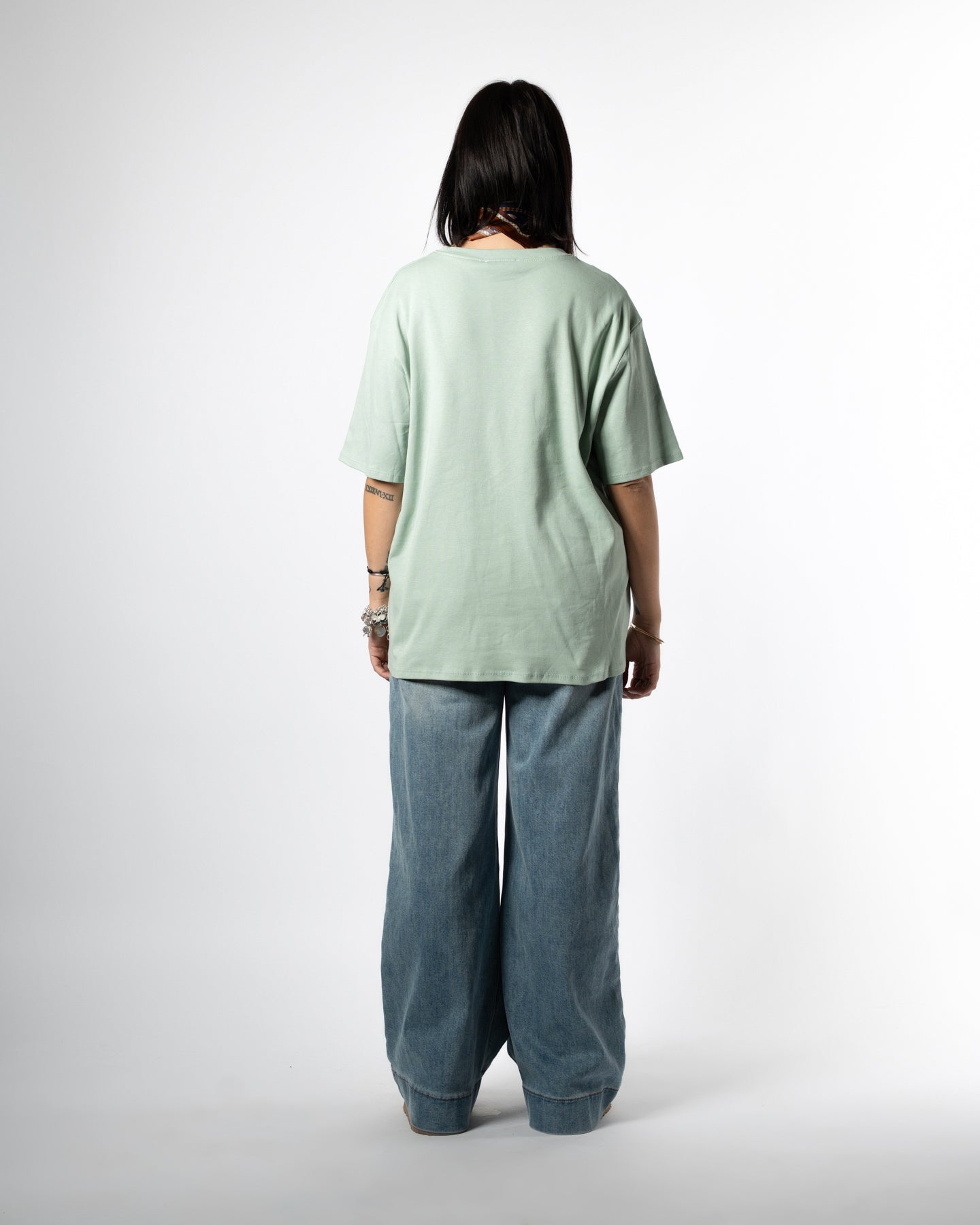 T-shirt basic color verde salvia, taglia unica con vestibilità over, adatta dalla 40 alla 48, realizzata in cotone elasticizzato.